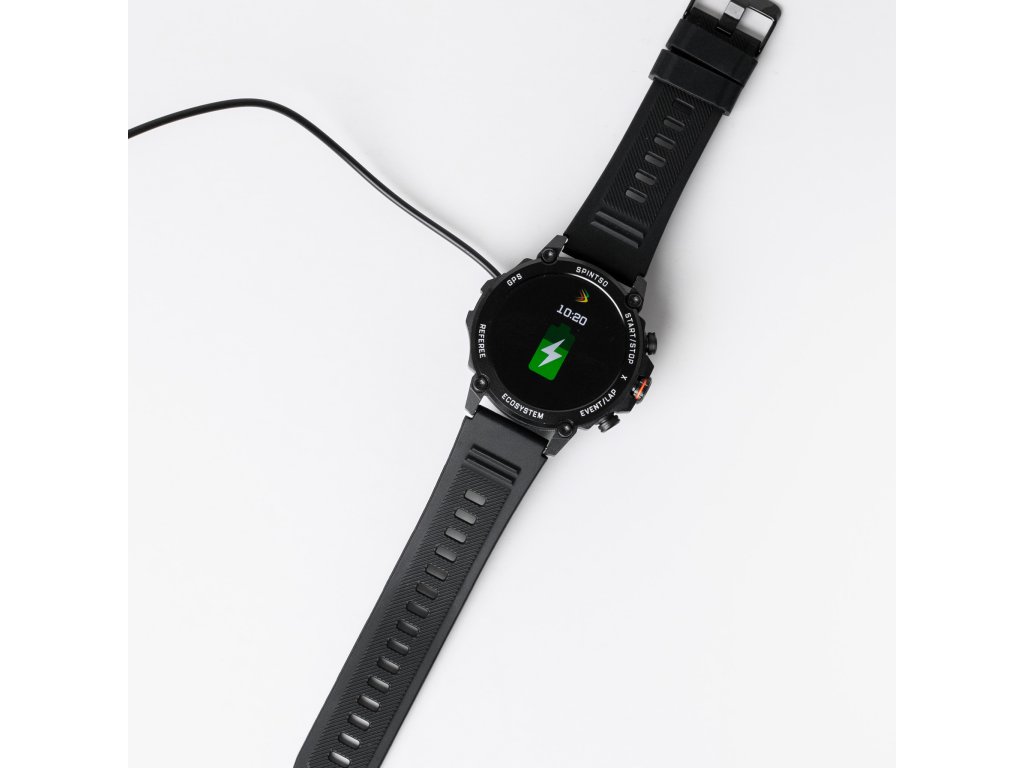 Chcete ušetřit ještě více? Aktivujte funkce jako „Otočte zápěstí“ pro automatické ztlumení displeje – a můžete získat až 15 hodin používání. Hodinky se nabíjejí pomocí dodané nabíjecí desky a stav baterie je jasně viditelný na obrazovce.